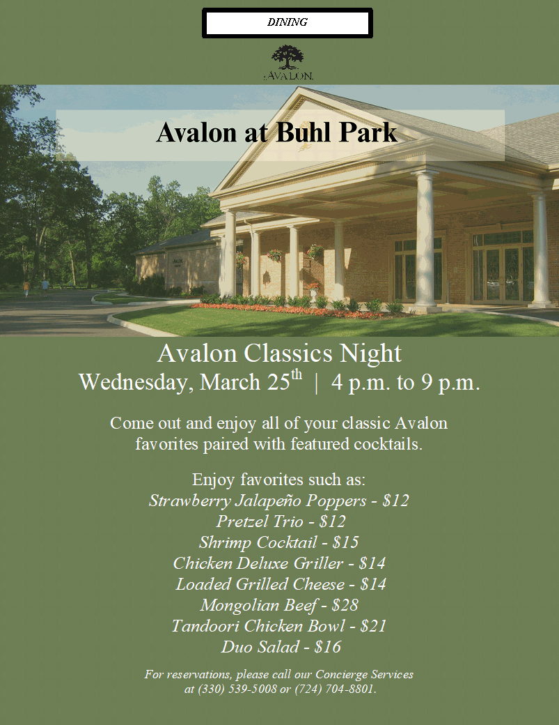 Avalon Classics Night Wednesday, March 25th at Buhl Park