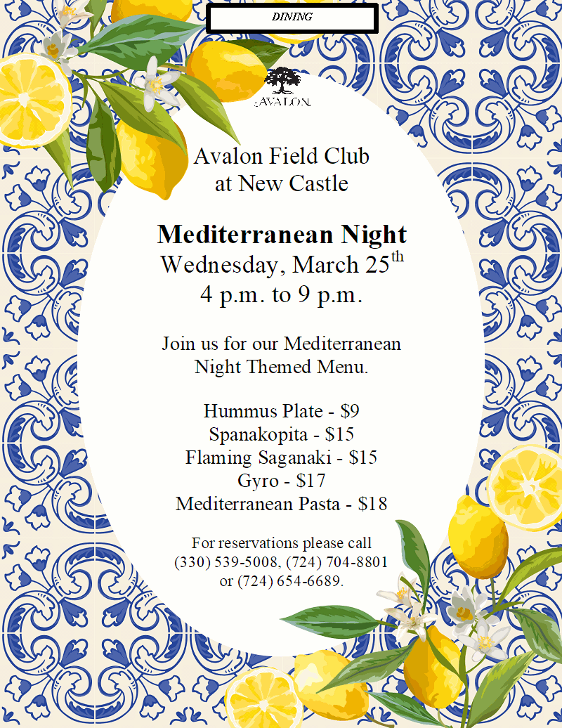 Mediterranean Night Wednesday, March 25th at Field Club