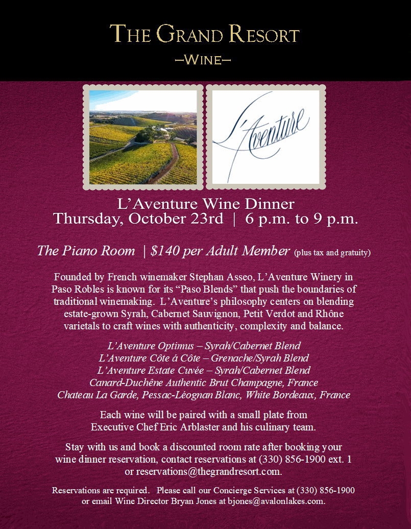 Oct 23 0 L’Aventure Wine Dinner Thursday, October 23rd at The Grand Resort By Secretary | Dining, Wine