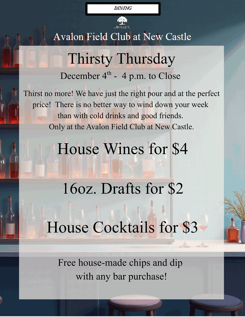Dec 04 0 Thirsty Thursday December 4th at Avalon Field Club at New Castle By Secretary | Dining, Wine