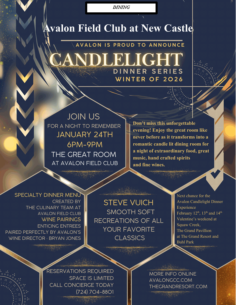 Jan 24 0 Candlelight Dinner Series Begins Saturday, January 24th at Avalon Field Club at New Castle By Secretary | Dining