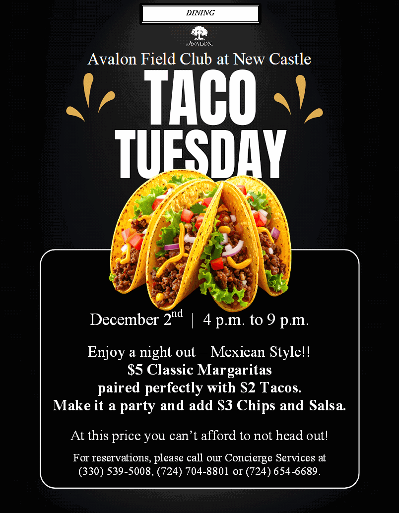 Taco Tuesday December 2nd at Avalon Field Club at New Castle