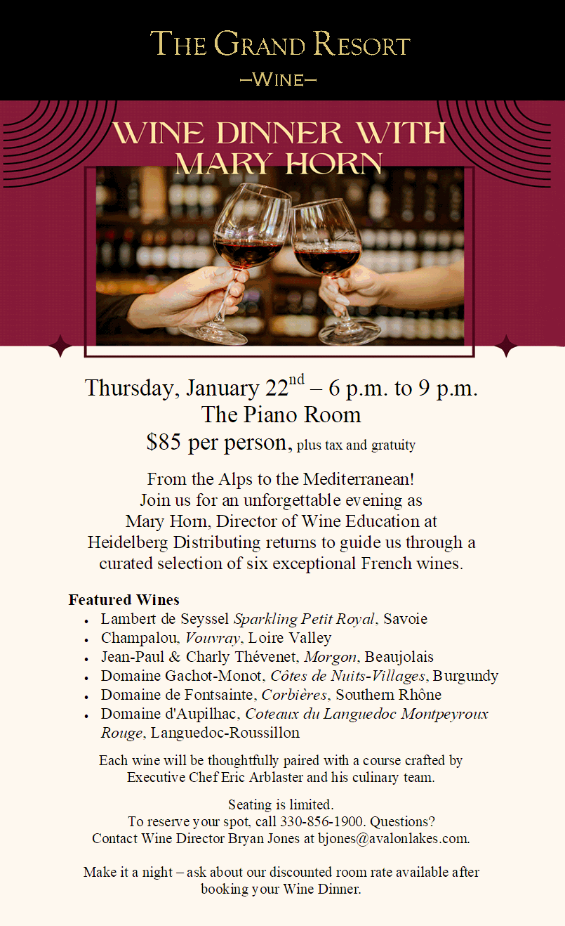 Jan 22 0 Wine Dinner with Mary Horn Thursday, January 22nd at The Grand Resort By Secretary | Dining, Wine