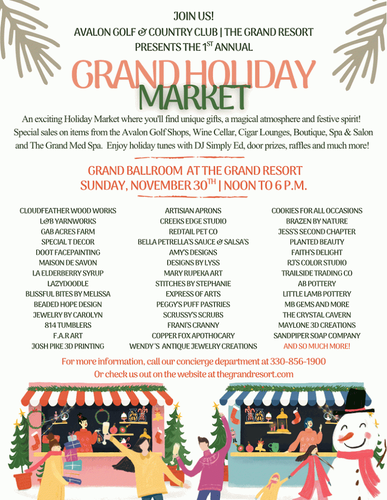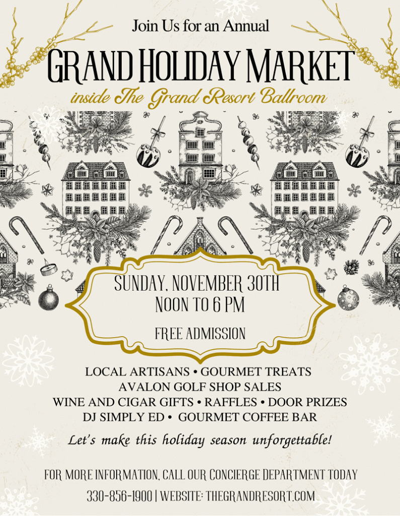 November 30, 2025 0 First Annual Grand Holiday Market Sunday, November 30th By Secretary | Dining, Golf, Spa, Wine
