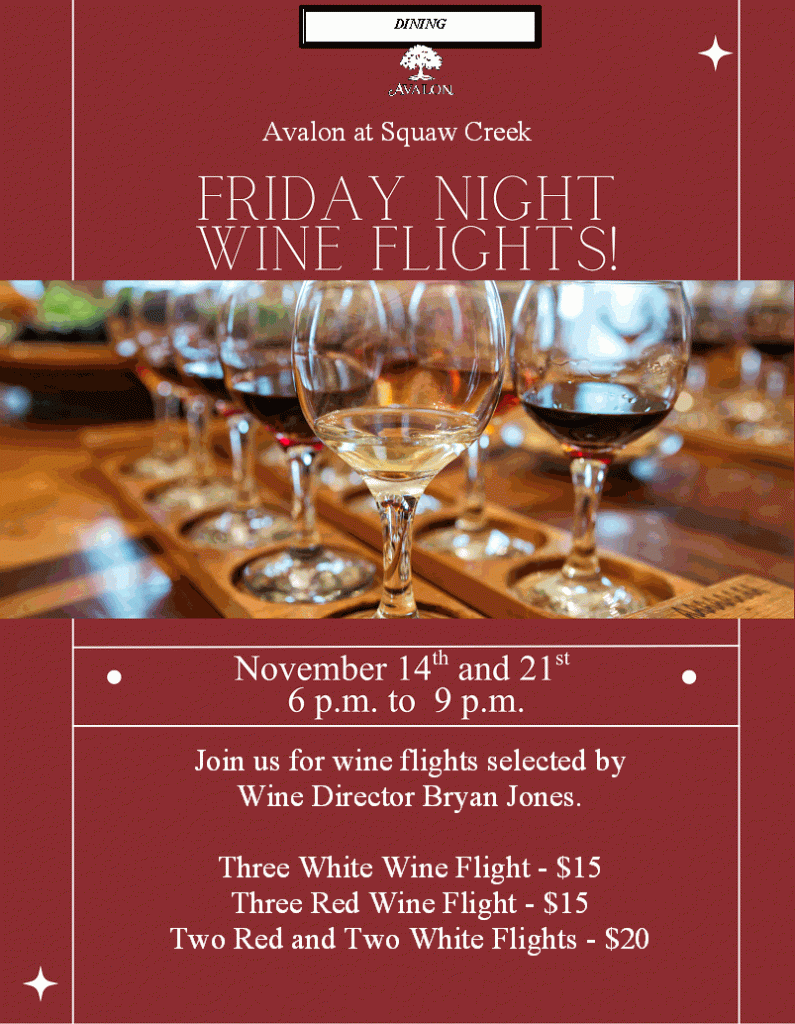 November 21, 2025 0 Friday Night Wine Flights November 14th and 21st Avalon at Squaw Creek By Secretary | Dining, Wine