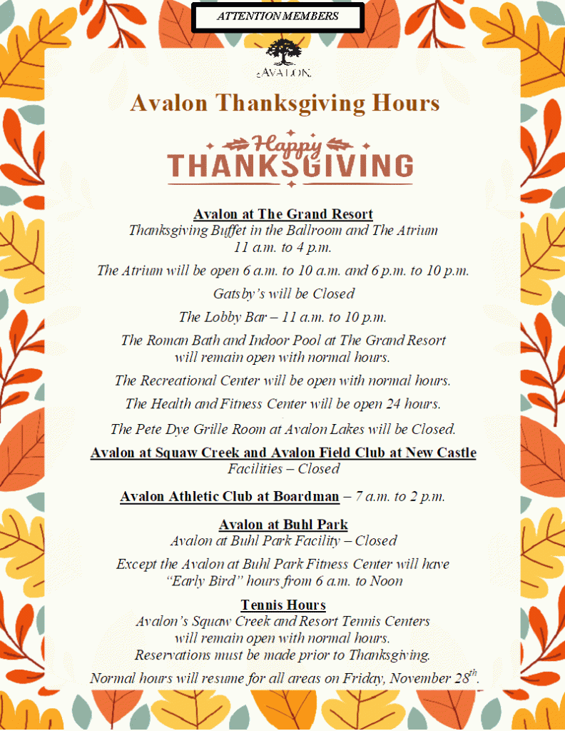 November 27, 2025 0 Thanksgiving Hours By Secretary | Cigar, Dining, Golf, Spa, Swimming, Tennis, Wine