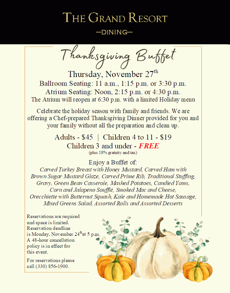 November 27, 2025 0 Thanksgiving Buffet Thursday, November 27th at The Grand Resort By Secretary | Dining