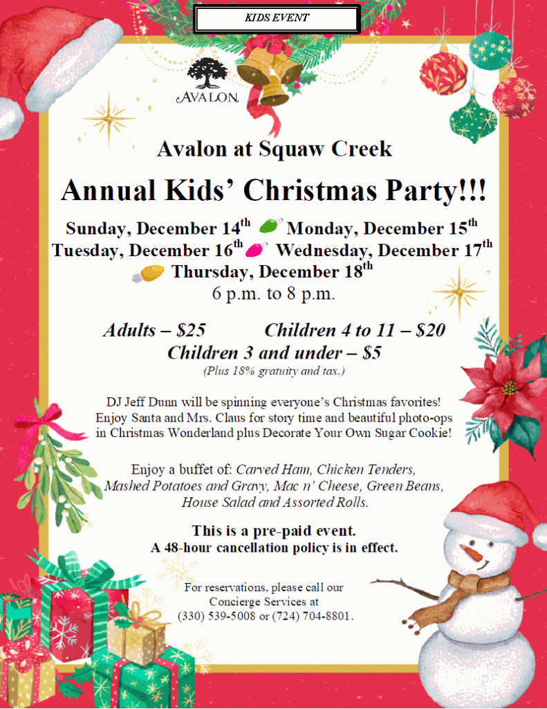 December 17, 2025 0 Annual Kids’ Christmas Party at Avalon at Squaw Creek By Secretary | Dining, Kids Activities / Childcare Sunday, December 14th through Thursday, December 18th Read More