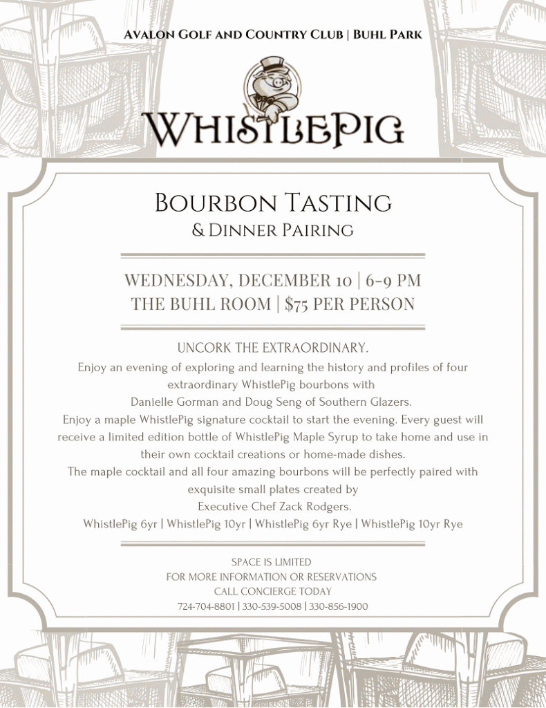 December 10, 2025 0 WhistlePig Bourbon Tasting & Dinner Pairing Wednesday, December 10th By Secretary | Dining, Wine Avalon at Buhl Park Read More