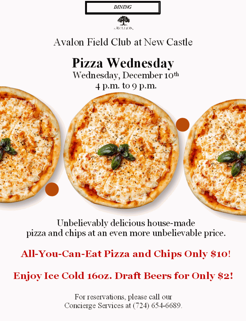 December 10, 2025 0 Pizza Wednesday, December 10th, at Avalon Field Club at New Castle By Secretary | Dining