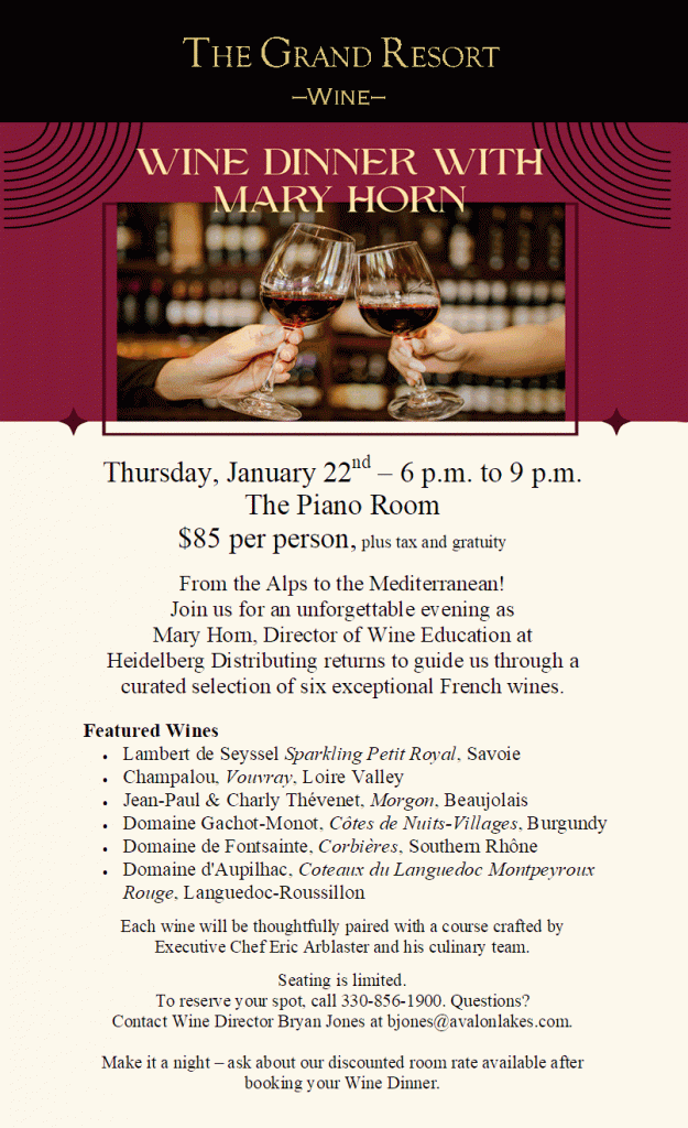 January 22, 2026 0 Wine Dinner with Mary Horn Thursday, January 22nd at The Grand Resort By Secretary | Dining, Wine