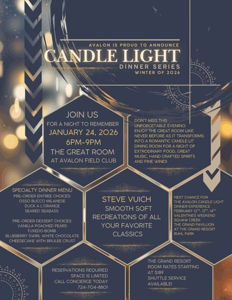 January 24, 2026 0 Candlelight Dinner Series Begins Saturday, January 24th at Avalon Field Club at New Castle By Secretary | Dining